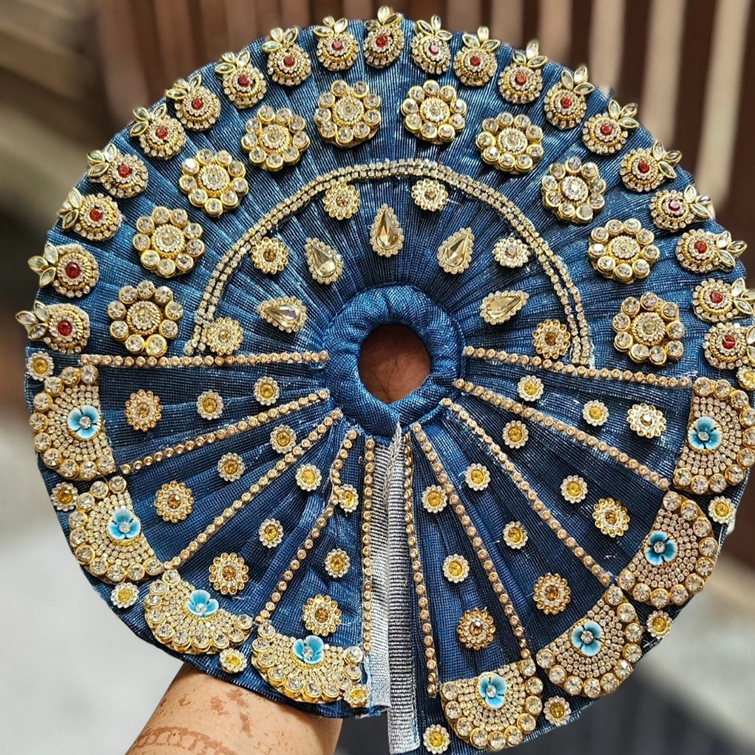 Elegant Kanha ji Poshak (Size 5) featuring a rich blue base with exquisite golden and stone embellishments. Highlighted with delicate turquoise floral motifs and intricate handwork, this poshak is perfect for daily worship or festive occasions, adding a royal and divine charm to your deity’s attire.