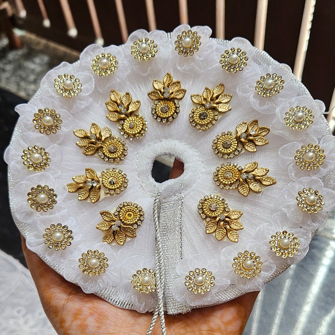 • The outer circle of the poshak is decorated with smaller, uniform faux pearl and gold zari work flowers, each surrounded by delicate net ruffles.